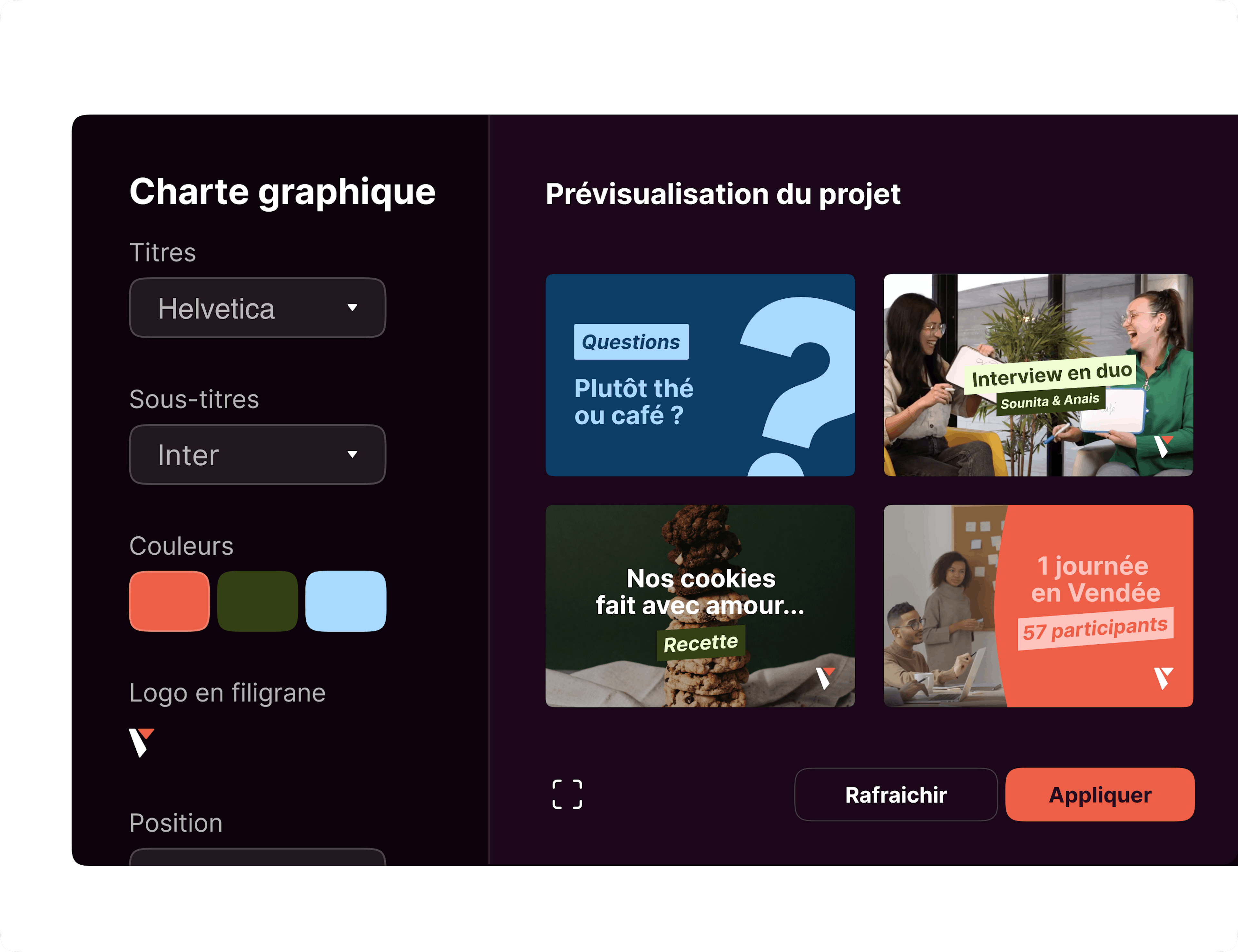 Votre charte graphique, vos couleurs, vos logos et votre ton de voix sont automatiquement intégrés. Chaque vidéo reste unique, cohérente et alignée à votre identité, où que vous la diffusiez.