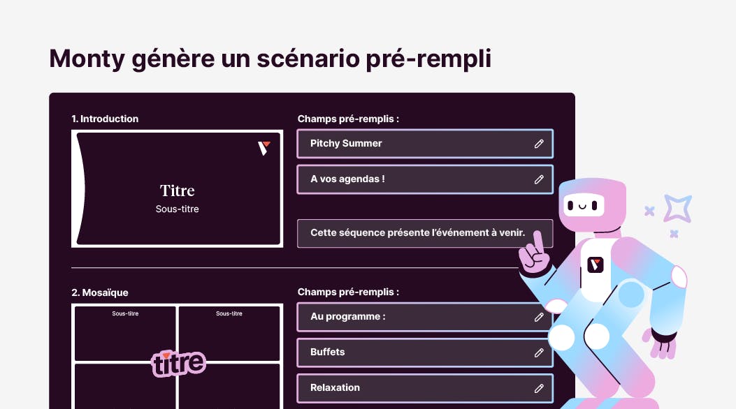En panne d’idées ou de structure pour votre prochaine vidéo ? Expliquez simplement votre besoin à Monty : il vous aide à clarifier votre message, à construire un script percutant et à transformer votre idée en une vidéo engageante, prête à diffuser.