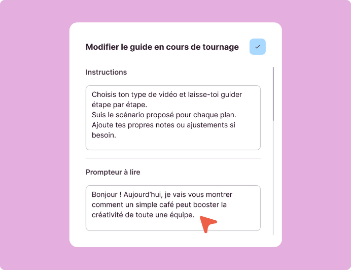 À partir de n’importe quel projet, vous pouvez générer un guide de tournage personnalisé en quelques clics. Ajoutez vos instructions, séquences vidéos, photos et textes pour donner un cadre clair à votre projet.