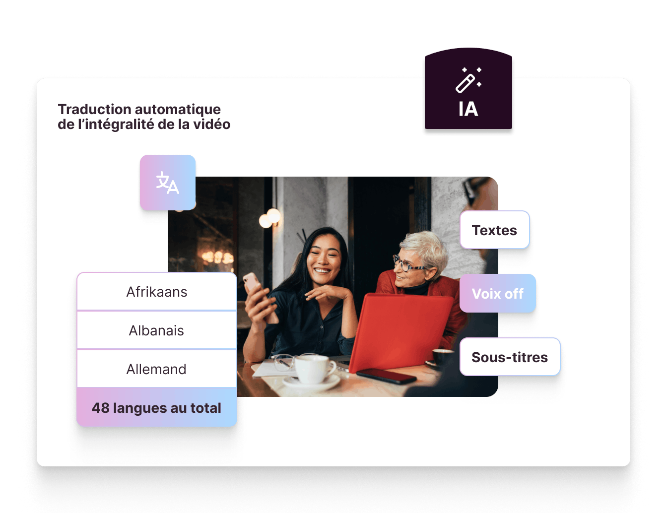 Vous avez besoin de décliner vos vidéos dans une ou plusieurs langues ? Gagnez un temps précieux grâce à notre fonctionnalité IA, en un seul clic toute votre vidéo se génère automatiquement dans la langue désirée.